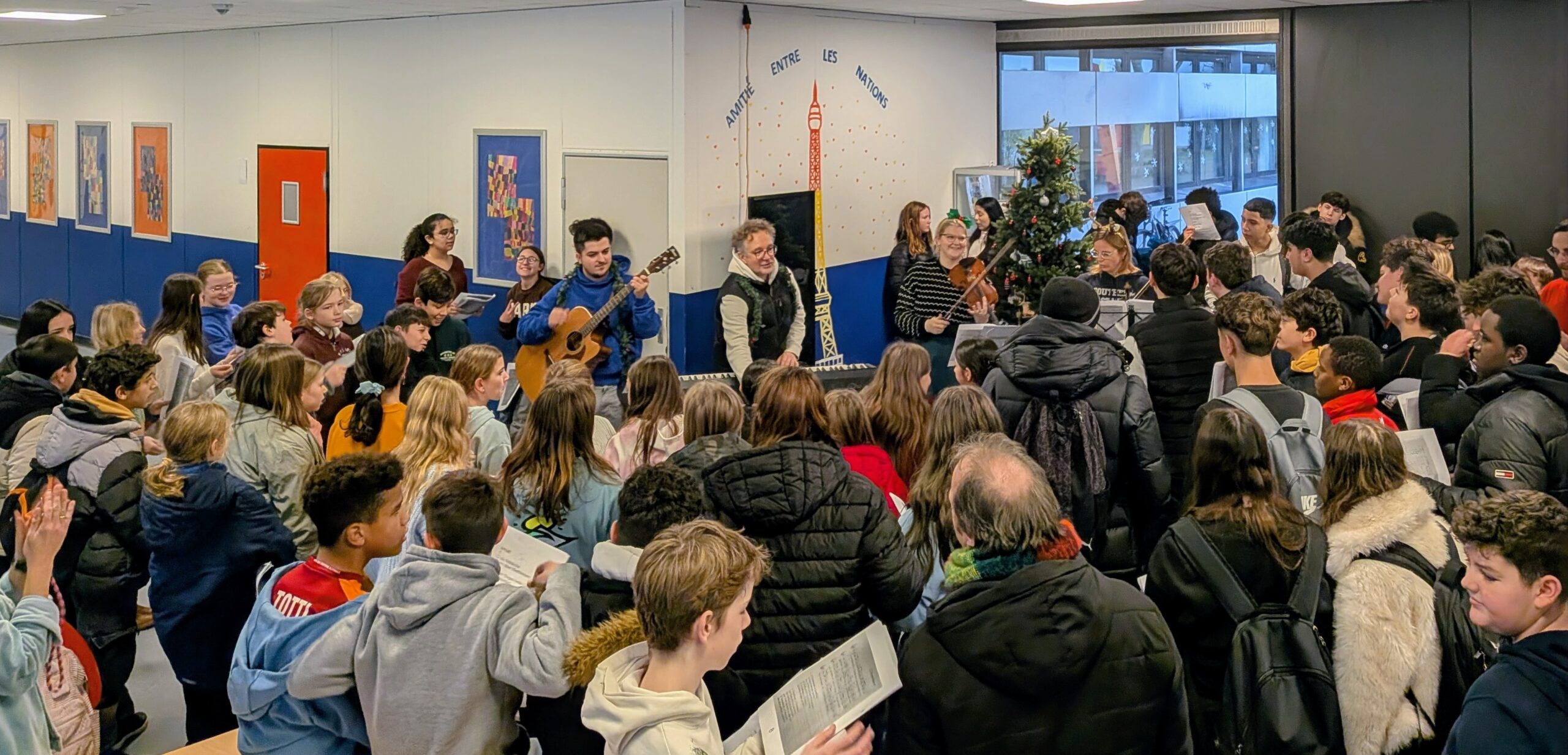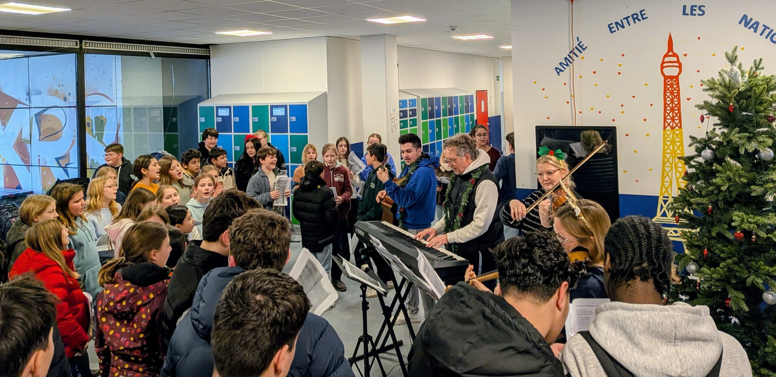 Begleitet wurden sie von der Lehrerband, die mit zwei Violinen, Gitarre und Klavier direkt neben dem festlich geschmückten Weihnachtsbaum spielte. Aus vielen Kehlen erklangen Klassiker wie Oh du fröhliche, Feliz Navidad und Last Christmas. Als krönender Abschluss durfte natürlich In der Weihnachtsbäckerei nicht fehlen – ein Lied, bei dem alle begeistert mitsangen.